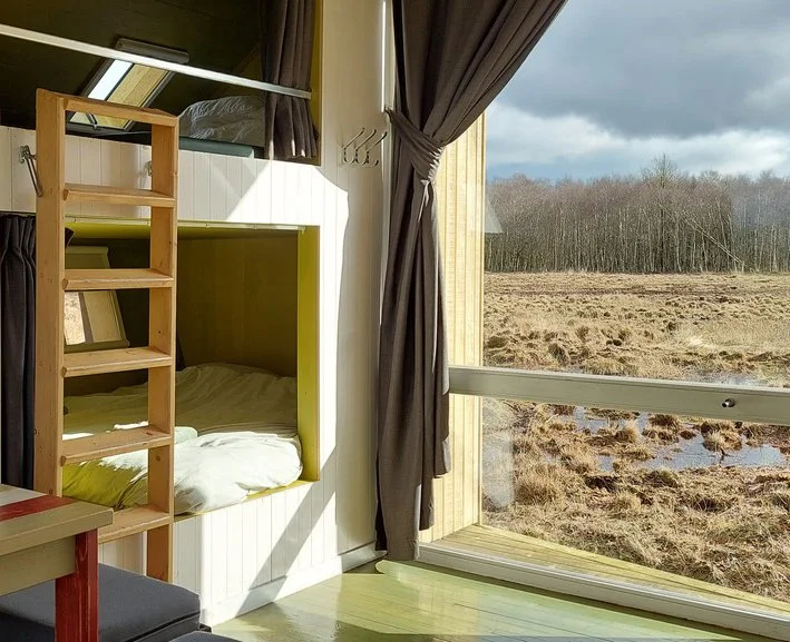 Een fijne natuurhut met een eigen wc, douche en keuken (met inventaris, waterkoker, percolator, koelkastje en 2-pits elektrisch plaatje) met warmwatervoorziening en verwarming. Deze trekkershut heeft vier vaste slaapplaatsen (eenpersoonsmatrassen) en een zithoek die tot twee slaapplekken omgebouwd kan worden. De hut is gemaakt van sloophout en heeft prachtig uitzicht, met een vuurplaats. De ingang van de Ree is gericht naar het ernaast gelegen gebied van Natuurmonumenten. Zo kunnen gasten vanaf het beschutte stoepje - of de ernaast gelegen eikenhouten picknicktafel - heerlijk genieten van het adembenemende uitzicht en de stilte. Een overnachting kan zonder Natuurkampeerkaart geboekt worden.